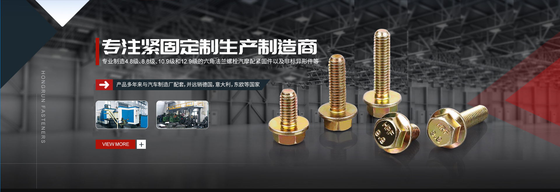 宏潤(rùn)緊固件有限公司是一家專(zhuān)業(yè)制造4.8級(jí)、8.8級(jí)、10.9級(jí)和12.9級(jí)的六角法蘭螺栓(包括防滑齒法蘭面螺絲、輪轂螺絲、安全帶螺絲)高強(qiáng)度汽摩配緊固件以及各種非標(biāo)異形件等。公司采用先進(jìn)的生產(chǎn)工藝,引進(jìn)數(shù)套臺(tái)灣多工位冷鐓機(jī),實(shí)行嚴(yán)格的生產(chǎn)管理。產(chǎn)品多年來(lái)與汽車(chē)制造廠(chǎng)配套,并遠(yuǎn)銷(xiāo)德國(guó),意大利,東歐等國(guó)家,品質(zhì)穩(wěn)定成熟。公司和國(guó)內(nèi)外客戶(hù)形成深度合作,成為他們長(zhǎng)遠(yuǎn)供貨廠(chǎng)家.....